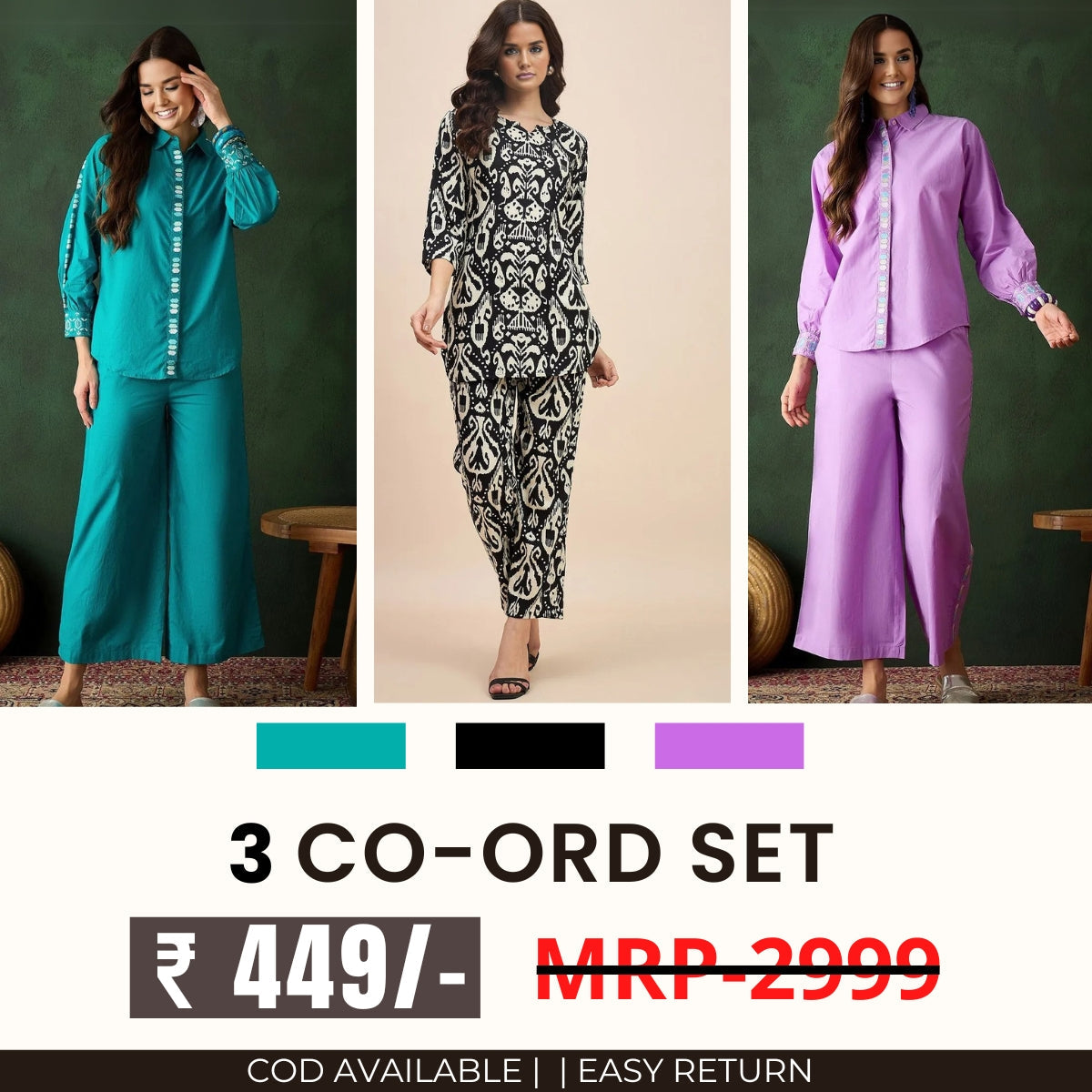 The 3 Co-ord Set Women Combo offers a versatile and stylish wardrobe upgrade for every occasion. This collection includes an elegant ethnic co-ord set, perfect for festive celebrations with its intricate prints and rich fabrics like silk or cotton in vibrant hues such as maroon or emerald green.