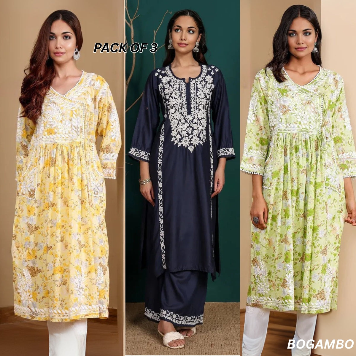 3 Combo Pack | Women Chikankari Work Kurti Set | Full Sleeves - CKW-02