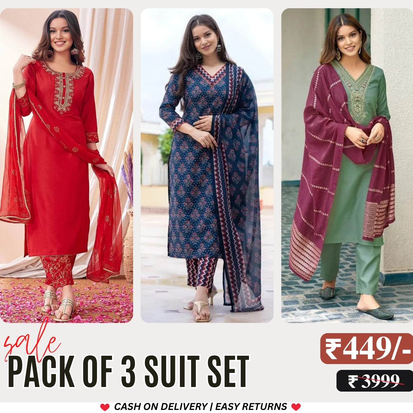 Step into timeless elegance with our Women’s Suit Set with Dupatta – 3 Combo Pack! 👗✨ Each combo includes three unique, beautifully designed kurta sets, complete with matching bottoms and dupattas. Crafted from premium, breathable fabrics, these sets are perfect for festive celebrations, office wear, or casual outings. With a blend of traditional patterns and modern silhouettes, you’ll always have the perfect outfit ready for any occasion!
